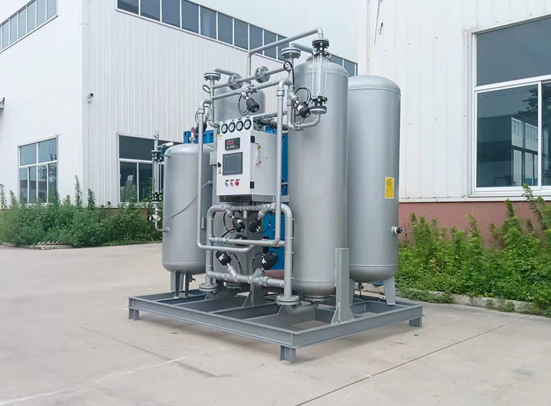 變壓吸附制氧裝置以潔凈的壓縮空氣為原料,采用高品質的沸石分子篩作為吸附劑,在一定的壓力下,從空氣中制取氧氣。經(jīng)過純化干燥的壓縮空氣,在吸附器中進行加壓吸附、減壓脫附。由于空氣動力學效應,氮在沸石分子篩微孔中擴散速率遠大于氧,氮被沸石分子篩優(yōu)先吸附,氧在氣相中被富集起來,形成成品氧氣。然后經(jīng)減壓至常壓,吸附劑脫附所吸附的氮氣等雜質,實現(xiàn)再生。一般在系統(tǒng)中設置兩個吸附塔,一塔吸附產(chǎn)氧,另一塔脫附再生,通過PLC程序控制器控制氣動閥的啟閉,使兩塔交替循環(huán),從而取得純度較高的氧氣(93%±3%)。