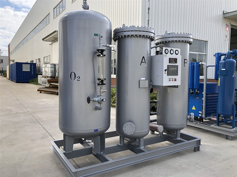 變壓吸附制氧裝置以潔凈的壓縮空氣為原料,采用高品質(zhì)的沸石分子篩作為吸附劑,在一定的壓力下,從空氣中制取氧氣。經(jīng)過純化干燥的壓縮空氣,在吸附器中進行加壓吸附、減壓脫附。由于空氣動力學(xué)效應(yīng),氮在沸石分子篩微孔中擴散速率遠大于氧,氮被沸石分子篩優(yōu)先吸附,氧在氣相中被富集起來,形成成品氧氣。然后經(jīng)減壓至常壓,吸附劑脫附所吸附的氮氣等雜質(zhì),實現(xiàn)再生。一般在系統(tǒng)中設(shè)置兩個吸附塔,一塔吸附產(chǎn)氧,另一塔脫附再生,通過PLC程序控制器控制氣動閥的啟閉,使兩塔交替循環(huán),從而取得純度較高的氧氣(93%±3%)。